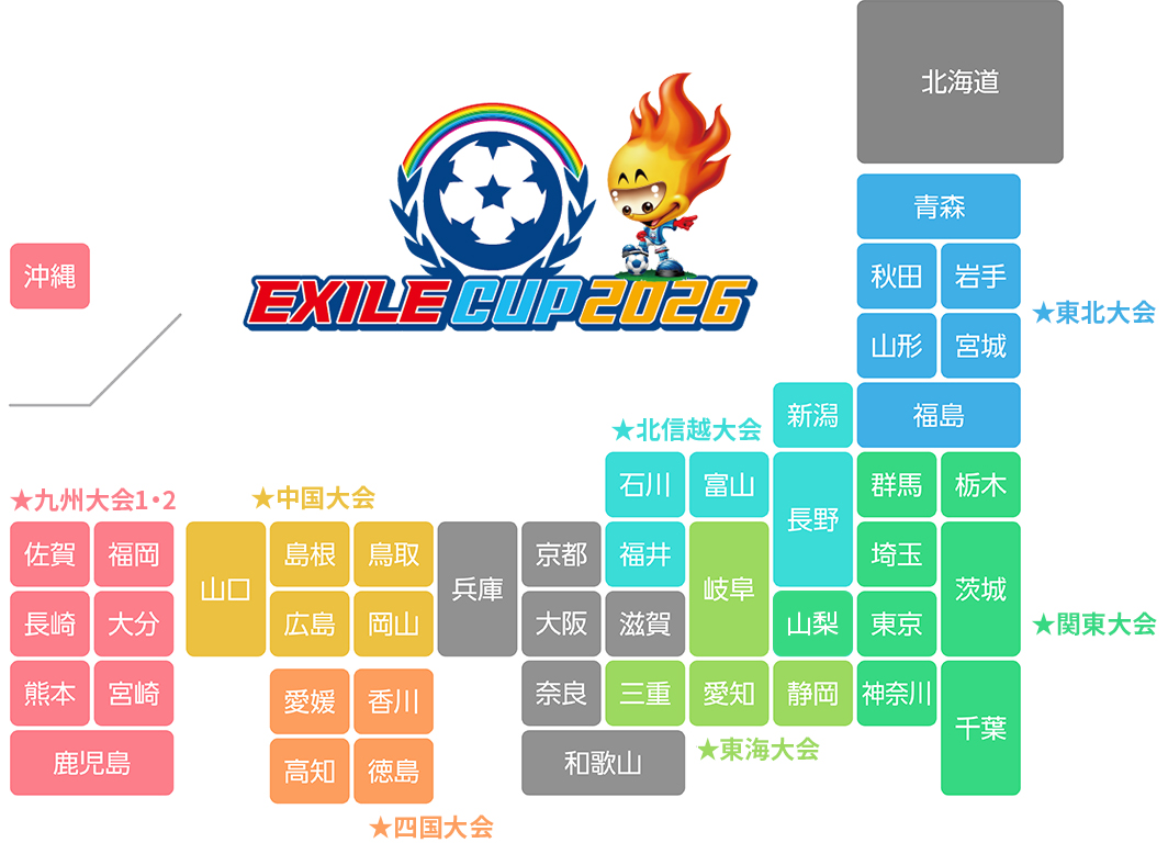 【2】各開催地区サッカー協会HP内の「EXILE CUP 2026」ページより「大会参加申込書(Excel)」と「募集要項(PDF)」をダウンロード。