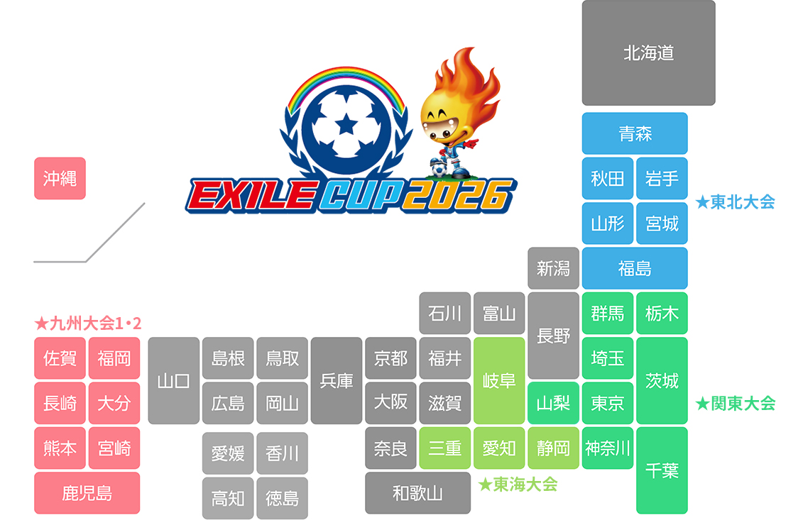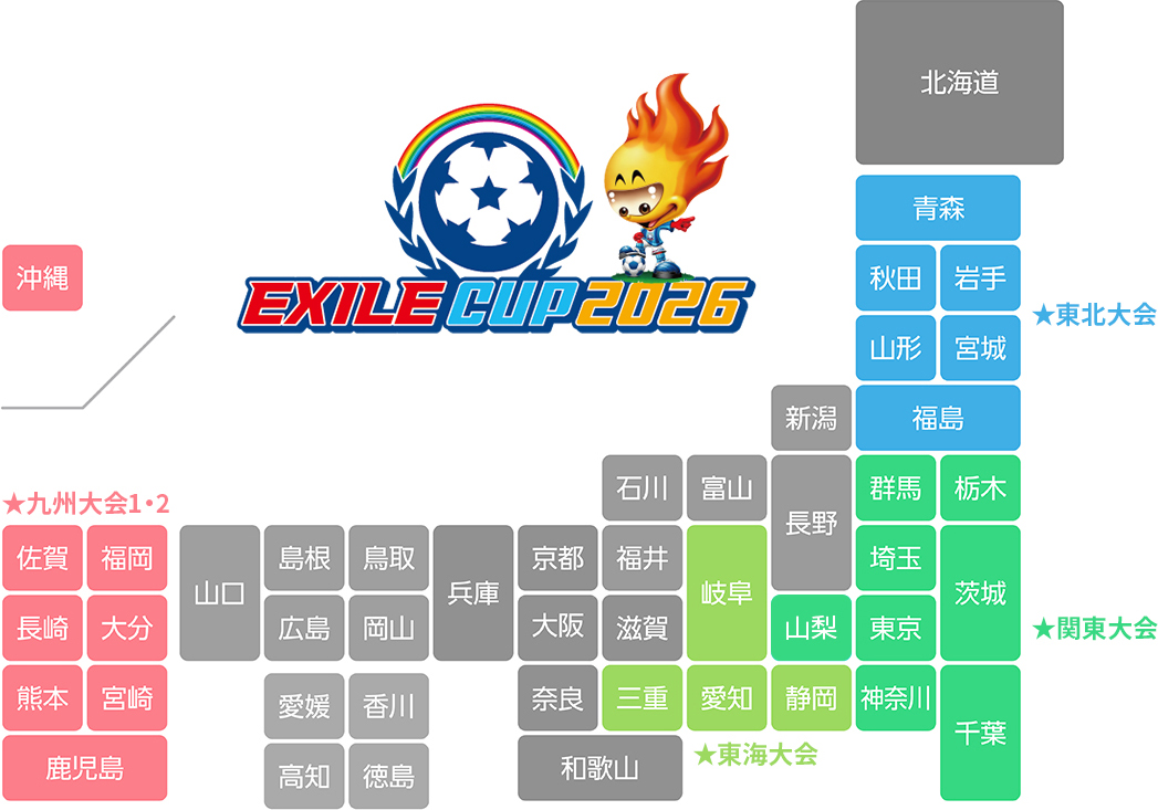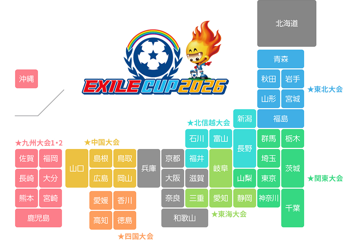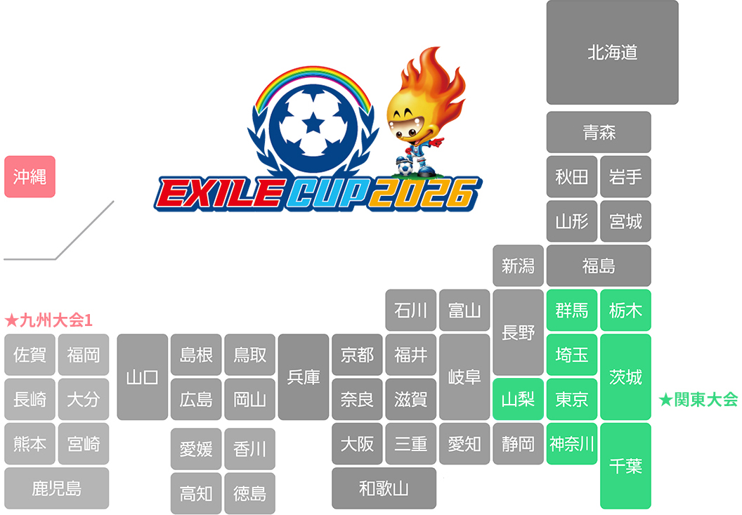 【2】各開催地区サッカー協会HP内の「EXILE CUP 2026」ページより「大会参加申込書(Excel)」と「募集要項(PDF)」をダウンロード。