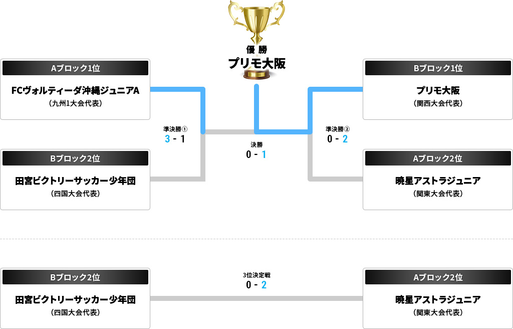 | C4 | 那覇ジュニアSC | ◯ 1-0 | ● 1-4 | ● 0-4 | 1勝 0分 2敗 | 3 | -6 | 3 |