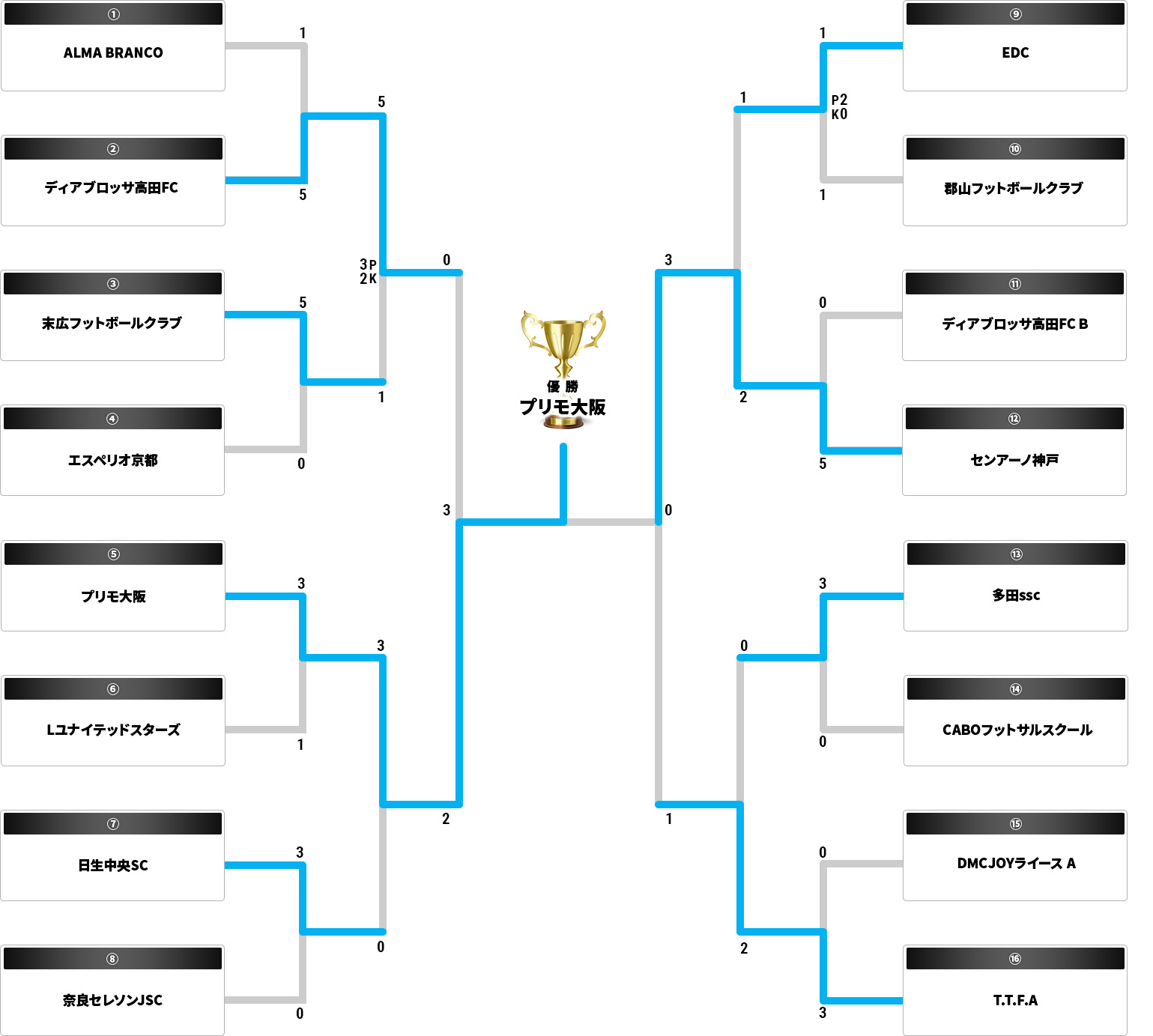B1 奈良セレソンJSC nodata ◯ 10-0 ● 3-6 ◯ 4-0 2勝 0分 1敗 6 11 2