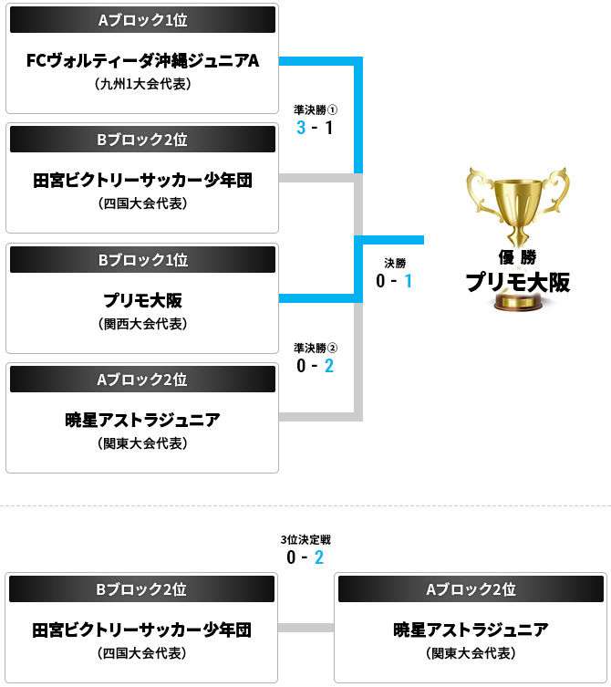 | C4 | 那覇ジュニアSC | ◯ 1-0 | ● 1-4 | ● 0-4 | 1勝 0分 2敗 | 3 | -6 | 3 |