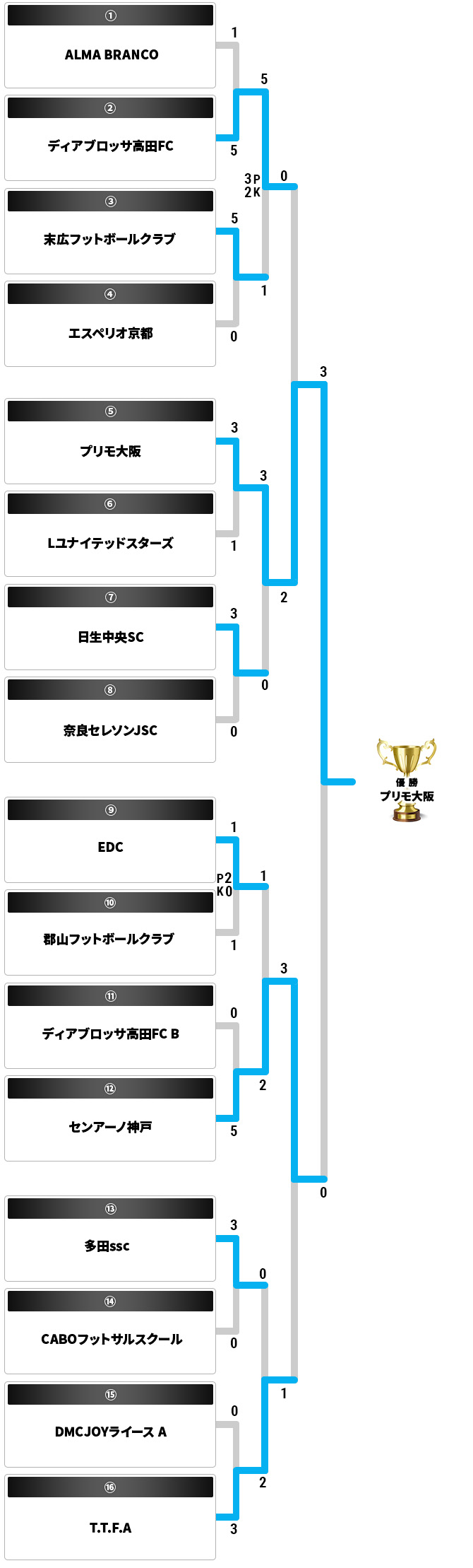 | D1 | ディアブロッサ高田FC | ◯ 6-2 | ◯ 14-0 | ◯ 24-0 | 3勝 0分 0敗 | 9 | 42 | 1 | |