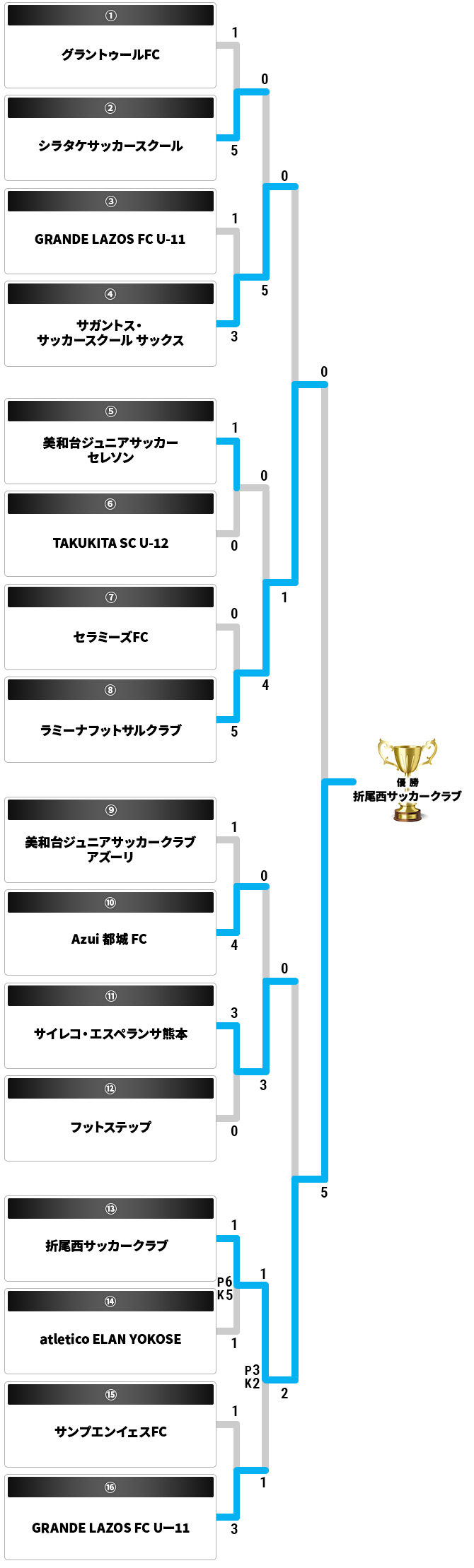 | A2 | GRANDE LAZOS FC U-11 | ◯ 3-0 | ◯ 11-0 | ◯ 14-1 | 3勝 0分 0敗 | 9 | 27 | 1 | |